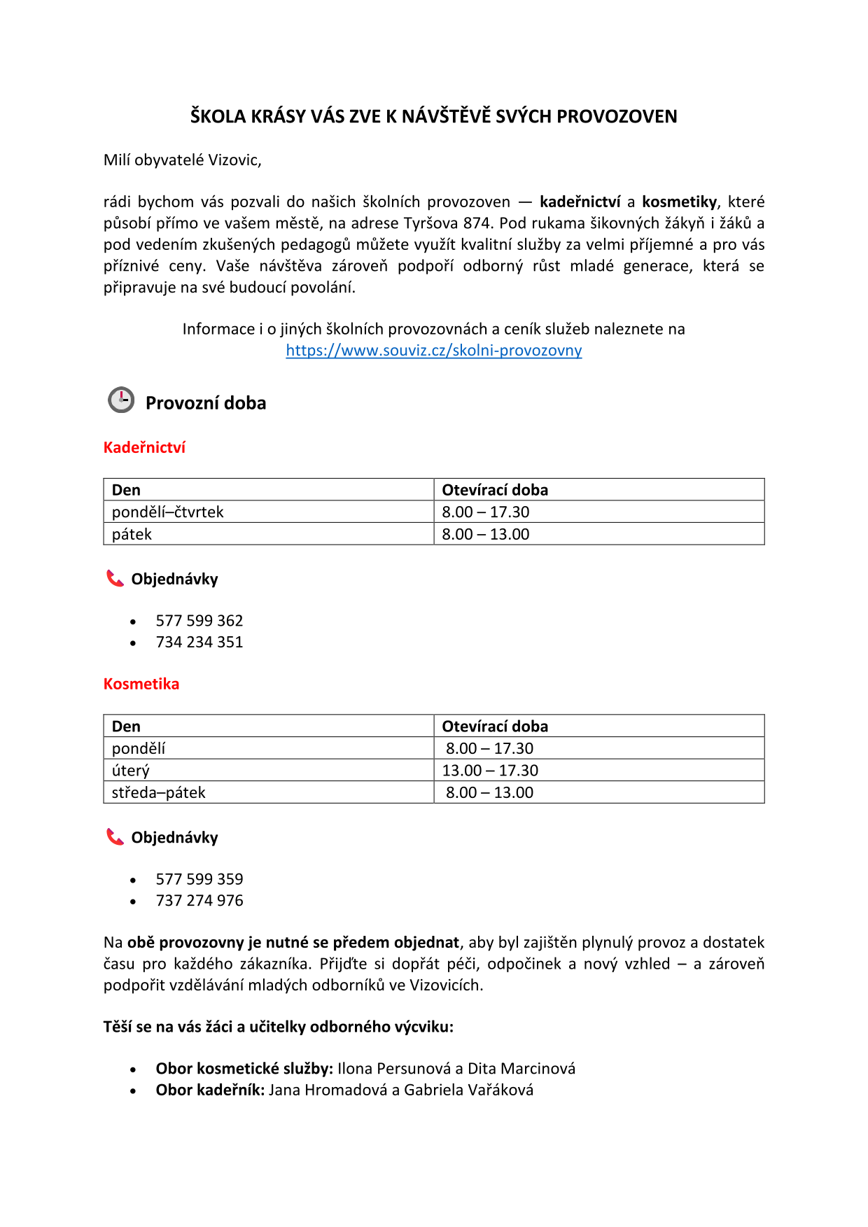 Kromě teoretického vyučování získávají studenti i praktické zkušenosti, zúčastňují se soutěží a své služby nabízejí také veřejnosti, což ne všichni Vizovjané vědí. I vy se tak můžete svěřit do jejich péče. Možná, že jim stříhání, barvení či jiná kadeřnická nebo kosmetická služba včetně šití oblečení budou trvat o trošku déle než zkušeným profesionálům, toto však jistě vynahradí velmi příznivá cena, kterou za jejich práci zaplatíte.