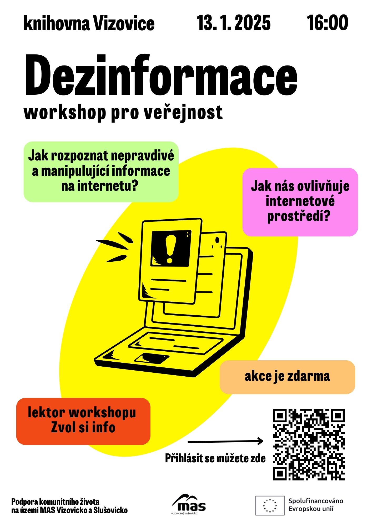 Dezinformace na nás útočí ve velkém všemi možnými informačními kanály. Jak se jim bránit? Na to odpoví workshop pro širokou veřejnost, který v pondělí 13. ledna pořádá MAS Vizovicko a Slušovicko v Městské knihovně Josefa Čižmáře Vizovice. Začátek je v 16 hodin.